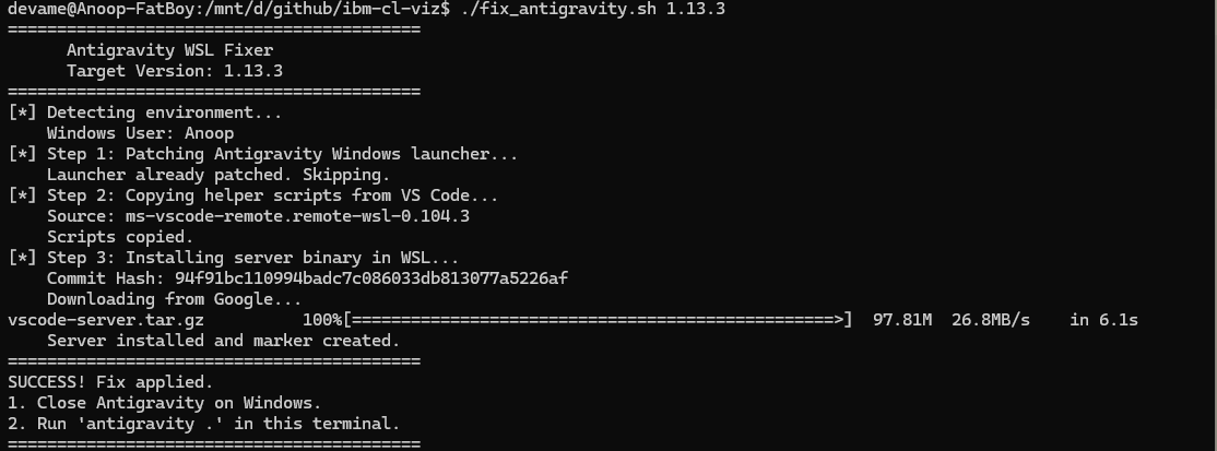Once the script finishes, run antigravity . from your project folder in WSL. It will detect the installed server, skip the broken download step, and connect immediately.